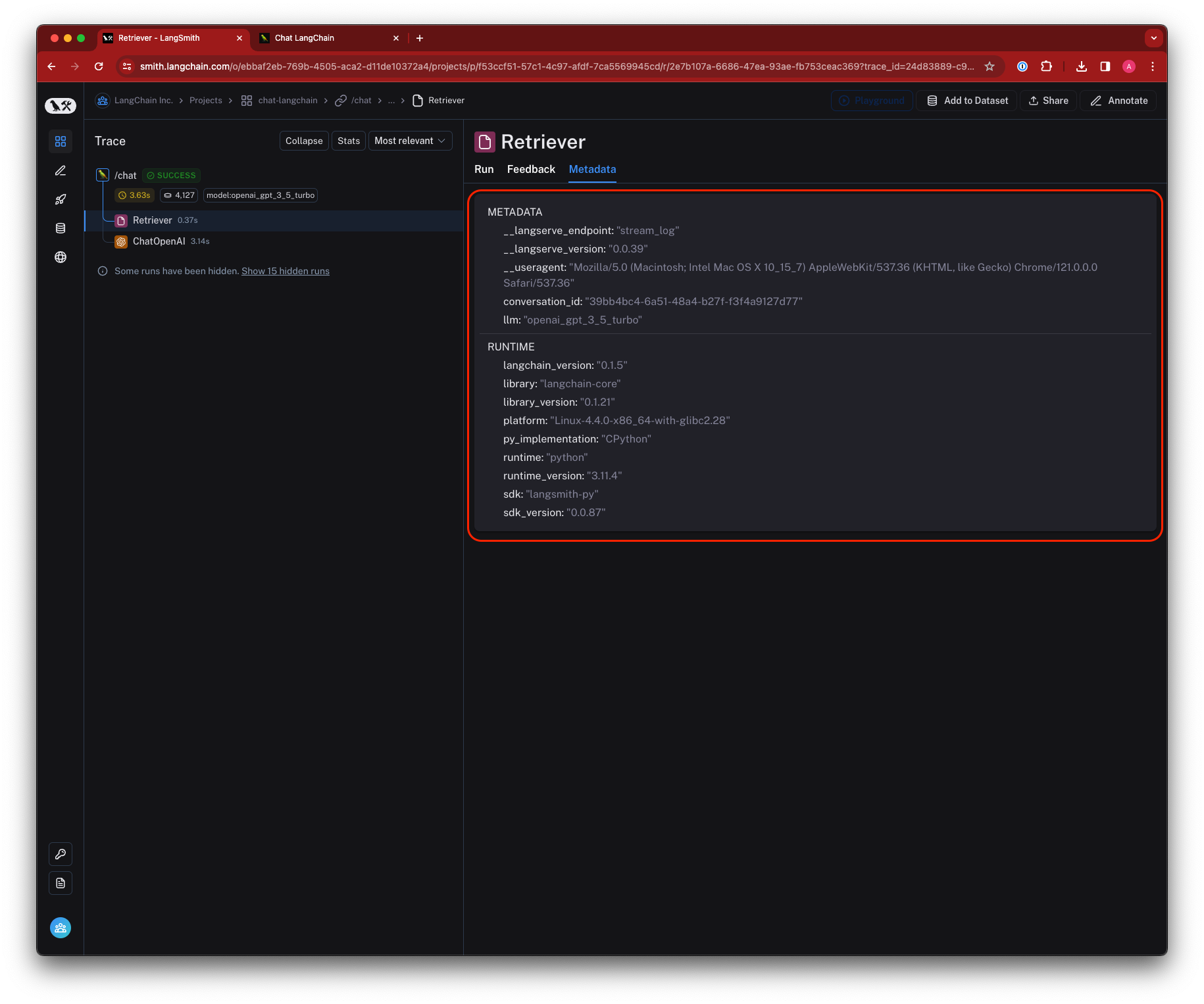 Similar to tags, you can use metadata to filter runs in the LangSmith UI, and can be used to group runs together for analysis. Learn how to add metadata to your traces